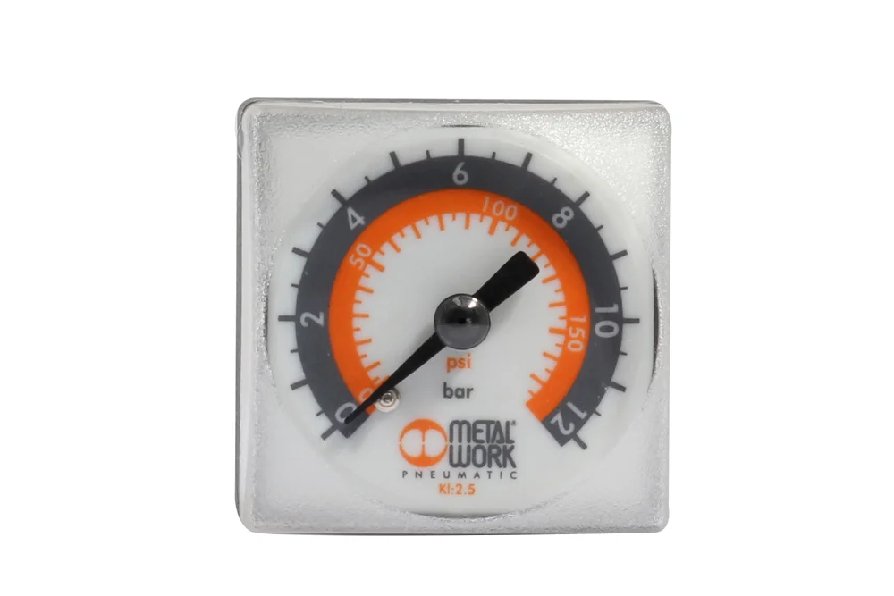 Universal pressure gauge mounted to reducers of types SYNTESI, BIT, SKILLAIR, and NEW DEAL with a square dial. The measurement range should be selected appropriately to the working pressure so that it does not exceed 75% of the maximum range. Scale expressed in bars and PSI. Size: 1/8″. Operating temperature: up to +50°C. Dial diameter: 40×40 mm. Measurement range: 0 ÷ 4 or 0 ÷ 12 bar. Housing material: plastic. Dial material: aluminum. Filling: none (dry gauge).