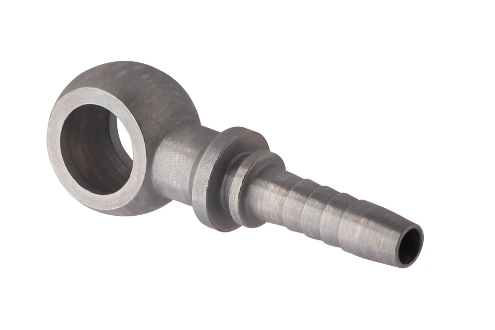 Standard hydraulic end (type Z – with a regular hydraulic “tail” for the hose), BANJO for a screw with metric thread (RNM). Designed for crimping in hydraulic and industrial hoses using a crimping sleeve suitable for the type of hose. Surface coated with zinc-nickel with a layer thickness of 6-10 µm, which is characterized by very high corrosion resistance (up to 720 hours without corrosion in a salt spray chamber). Material: carbon steel, zinc-nickel.
