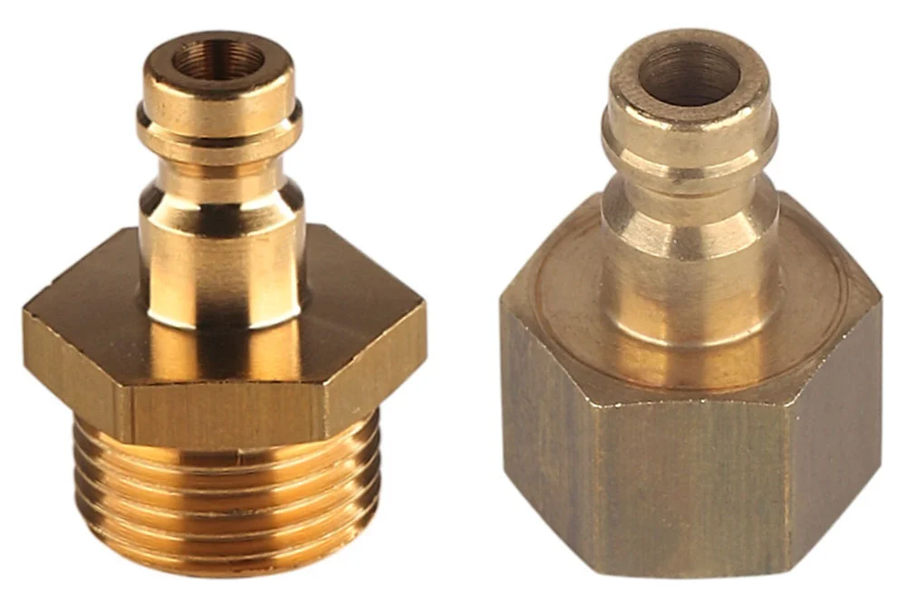 Eurostandard MINI DN 5 quick coupling plug, without valve, with external or internal BSP thread, widely used in the industry (for air, nitrogen, and other non-flammable gases), where small dimensions and high flow efficiency with low pressure drop are required. Interchangeable with RECTUS 21 and EURO DN 5 quick couplings from other manufacturers. Working pressure: 35 bar. Operating temperature: from -20°C to +100°C. Material: brass.