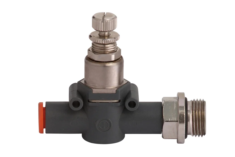 Miniature RML type pressure reducing valve (plug-in connection at the inlet and threaded connection with an O-ring at the outlet) designed to reduce higher pressure to lower pressure downstream of the valve. Output pressure range: 1 ÷ 8 bar. Working pressure: 10 bar. Operating temperature: from -20°C to +60°C. Medium: filtered compressed air, oiled or non-oiled.
