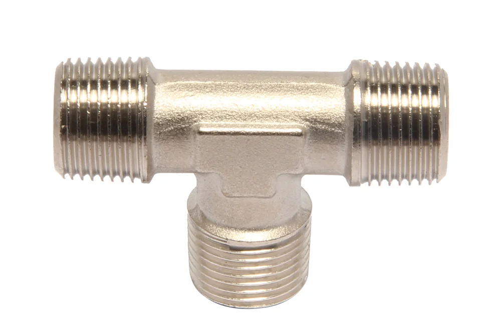 T-shaped “T” fitting with external BSPT threads type A16, intended for connecting pneumatic components (including hoses) together. The tightness of the connection usually requires the use of additional seals. In the case of tapered threads, Teflon tape or sealant is needed; for cylindrical threads, aluminum or copper washers are required. Material: nickel-plated brass. Working pressure: 60 bar.
