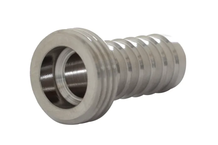 NiTO hose end made of AISI 316L stainless steel with external thread. Available in two sizes: 1/2″ and 3/4″. Used in conditions with high hygiene and corrosion resistance requirements (e.g., food industry, hospitals). Material: AISI 316L steel. Working pressure: up to 25 bar. Operating temperature: from -20°C to +150°C.