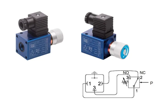 Pressure switch used in hydraulic power systems. Signals the achievement of a specified oil pressure value. The regulated value is adjusted using a knob. Installation is possible using a thread or plate connection. Material: aluminum (housing). Sealing: NBR. Pressure adjustment range: 2 ÷ 400 bar. Maximum load: 5 A at 250V AC; 0.25 A at 125V DC. Protection degree: IP 65. Operating temperature: from -20°C to +80°C.