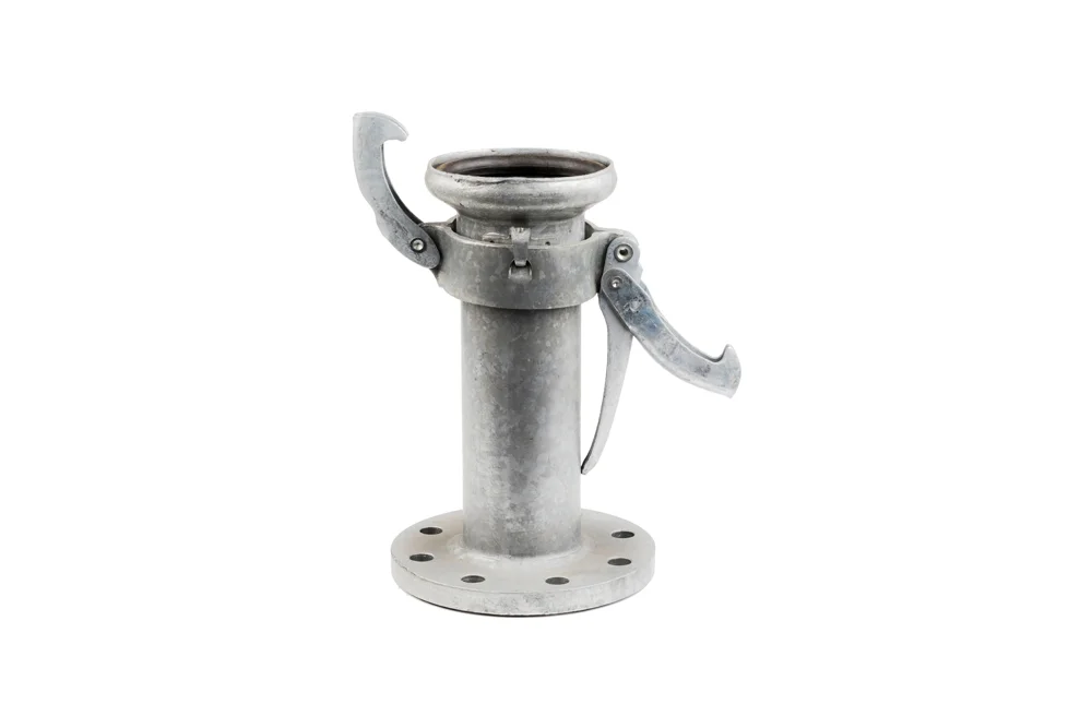 PERROT lever coupling socket with PN 10 flange, widely used in agricultural farms, horticulture, industry, construction, road and tunnel building, groundwater drainage, wastewater treatment plants, sewage discharge, and environmental protection. Material: carbon steel, galvanized. Sealing: SBR. Working pressure: up to 10 bar.