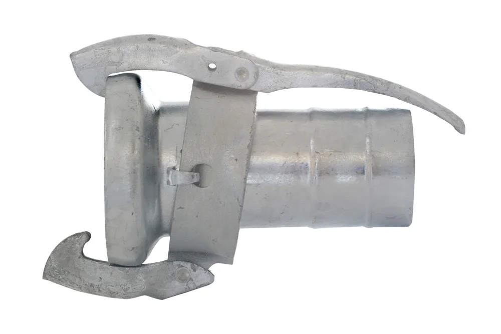 PERROT lever connector socket with flared end for hose, widely used in agricultural farms, horticulture, industry, construction, road and tunnel building, groundwater drainage, wastewater treatment plants, sewage discharge, environmental protection. Material: carbon steel, galvanized. Sealing: SBR. Working pressure: up to 10 bar (up to 8 bar for size 216 mm).