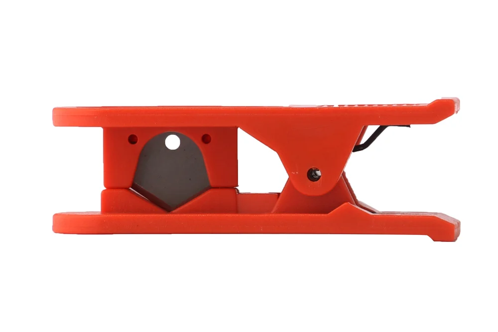 Plastic hose cutter for diameters ranging from 3 to 12 mm. Color: orange.