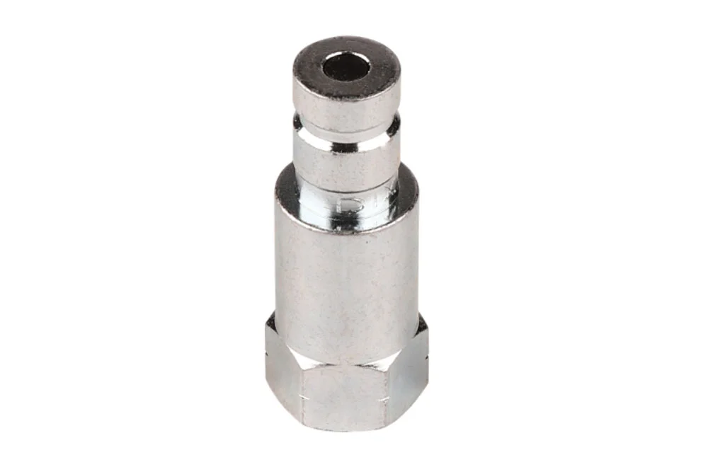 Plug with shut-off valve for diagnostic quick coupling, with internal NPT thread, used for pressure measurement in hydraulic systems. Manufactured according to ISO 15171-1 and SAE J1502 standards, interchangeable with connectors from other manufacturers. Quick coupling plugs made of hardened steel are typically permanently installed in the hydraulic system, while the quick coupling sockets remain connected by a hose to the pressure gauge. The connection of the socket to the plug should only occur when the system is not operating, with no pressure or very low pressure of a few bars. The working pressure for the plug not connected to the socket is 400 bar, and the minimum burst pressure is 1600 bar. The working pressure for the connected socket and plug is also 400 bar, while the minimum burst pressure is 1300 bar. The socket and plug are equipped with valves that ensure leak-free connection and disconnection as well as sealing. Their flat surfaces minimize residual oil leakage and air inclusion into the system (leakage approx. 0.1 ml during disconnection, air inclusion approx. 0.02 ml during connection). For proper operation, it is essential to maintain the cleanliness of the valve surfaces. Working pressure: 400 bar. Burst pressure: 1300 bar. Vacuum: up to 0.9 bar. Hydraulic oil flow at Δp = 3 bar: 4.2 [l/min]. Material: galvanized steel. Sealing: NBR. Operating temperature: from -40°C to +120°C.