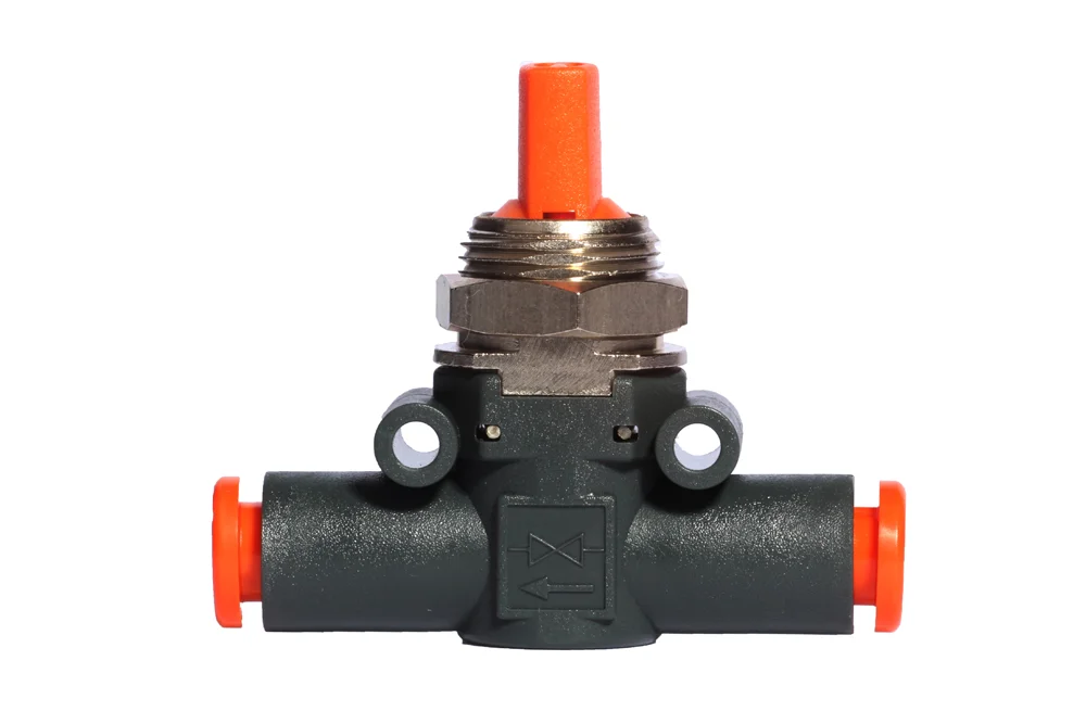 V2V L type shut-off valve, two-position, two-way, with both ends terminated with plug connections (hose – hose). Working pressure: 10 bar. Operating temperature: from -20°C to +60°C. Medium: filtered compressed air, oiled or non-oiled.