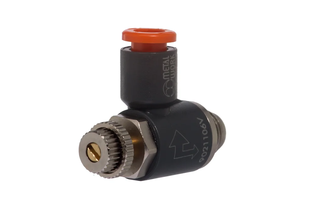 Throttle-reverse valve type MRF NTV series COMPACT “N” for installation in the connections of distribution valves, used in pneumatic systems for regulating the flow rate of compressed air and the direction of flow. Equipped with a plug-in coupling for easy disassembly of pneumatic hoses. Adjustment change via a control knob and/or screwdriver; possibility of securing the setting with a locking nut. Size: M5, 1/8″, 1/4″, 3/8″, 1/2″. Working pressure: up to 10 bar. Operating temperature: from -10°C to +50°C. Material: plastic.
