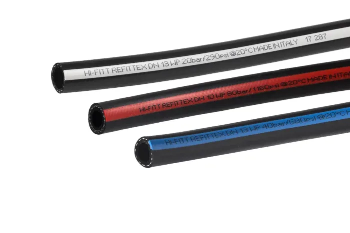 Flexible hose with a smooth inner surface designed for compressed air, water, light chemicals, fungicides, fertilizers, and pesticides. Commonly used in agriculture for spraying, irrigation, and applications. The outer layer is resistant to abrasion and weather conditions. Inner layer: black PVC. Reinforcement: polyester braid (double polyester braid for REFITTEX 80 BAR version). Outer layer: black PVC. Working pressure at 20°C: 20 bar (white stripe), 40 bar (blue stripe), 80 bar for internal diameter 13 mm, above 50 bar (red stripe). As the operating temperature increases, the working pressure value of the hose decreases. Operating temperature: from -20°C to +60°C.