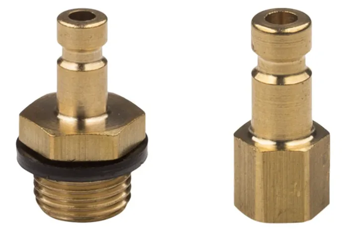 Quick coupling plug of very small size DN 2.7 series 20KA, with external or internal BSP or metric thread. One-sided shut-off version without valve. Designed for water, air, nitrogen, and other non-flammable gases. Working pressure: 35 bar. Material: brass. Operating temperature: from -20°C to +100°C.
