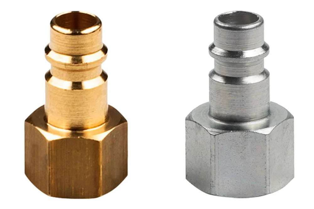 Quick coupling plug with a popular Eurostandard profile DN7.2 without a valve, featuring internal BSP thread, for use in pneumatic installations (air, nitrogen, other non-flammable gases). The plug is available in two material variants: brass and galvanized carbon steel. For intensive use, vibrations, and pneumatic tools, it is recommended to use plugs made of carbon steel (lower wear). The quick couplings are interchangeable with all quick couplings from other manufacturers according to Eurostandard DN7.2 ÷ 7.8 and compatible with tools found in stores. Easily operated with one hand up to a pressure of 8 bar. Working pressure: 16 bar. Material: brass or galvanized carbon steel. Operating temperature: from -20°C to +100°C.