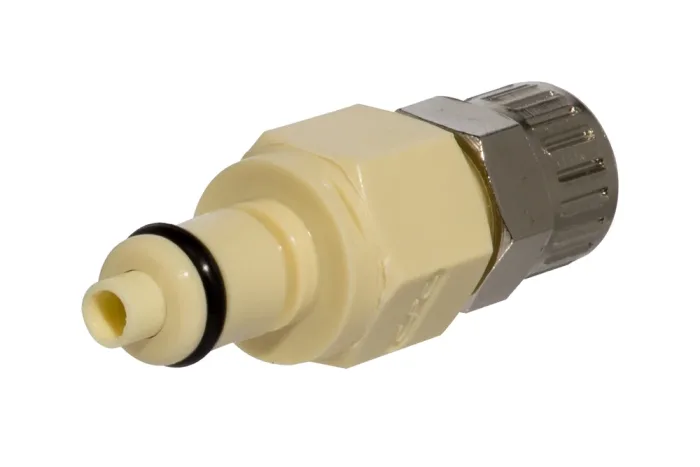 Quick-connect plug for hose with nut and valve is intended for gas detection, medical devices, chemical analyzers, inkjet printing, as equipment for optical devices, etc. The effectiveness of the connection is indicated by an audible click. Length L [mm] – total length. Material: polypropylene. Sealing: EPDM o-ring. Working pressure: up to 8.3 bar. Operating temperature: from 0°C to +71°C.