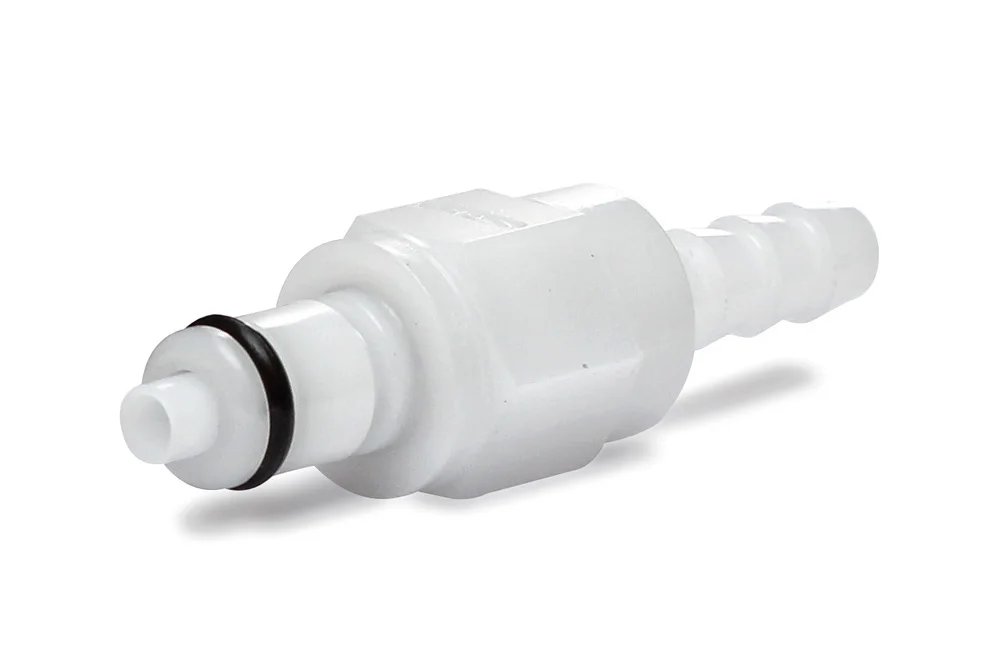 Quick coupling plug with valve for hose is intended for gas detection, medical devices, chemical analyzers, inkjet printing, as equipment for optical devices, etc. The effectiveness of the connection is indicated by an audible click. Length L [mm] – total length. Material: acetal (NBR o-ring). Working pressure: up to 8.3 bar. Operating temperature: from -40°C to +82°C.