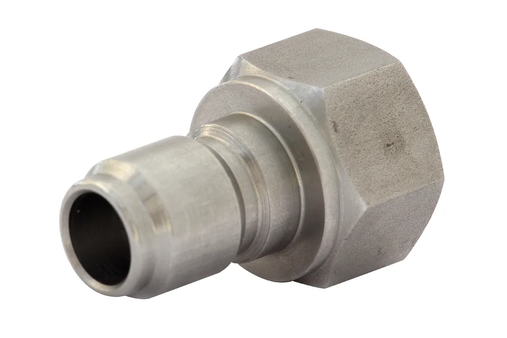 Quick coupling plug DN11.8 with internal thread facilitating quick connection of the water gun to the hose or other washing accessories. Material: AISI 303/304L steel. Working pressure: 200 bar. Operating temperature: up to +100°C.