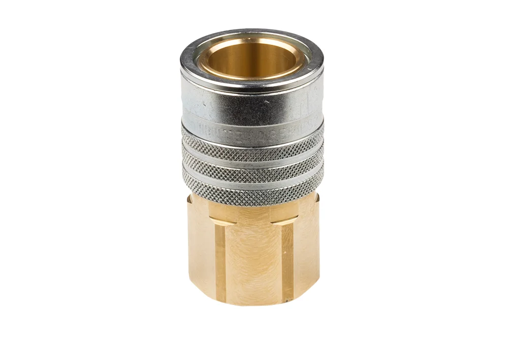 Universal quick-connect socket with a large diameter and internal BSP thread, primarily intended for compressed air. Used for large pneumatic installations, compressors, and tools with very high flow rates. Material: brass (socket), galvanized steel (sleeve), stainless steel (balls and springs). Performance: 12000 l/min at an inlet pressure Pe=6 bar, Δp=0.5 bar, air. Working pressure: 20 bar. Operating temperature: from -20°C to +100°C (NBR), depending on the medium.