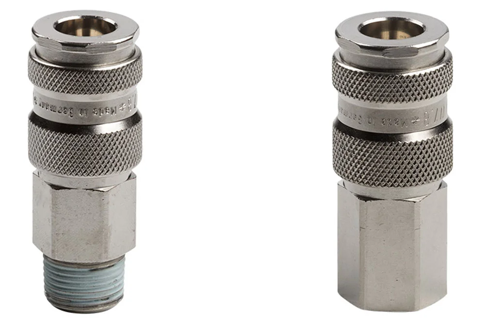 Quick coupling socket with valve DN7.8, with external BSPT thread or internal BSP thread, featuring a durable construction and a very high flow coefficient, thanks to the ULTRA-FLOW valve. Interchangeable with all quick couplings according to Eurostandard DN7.2 from other manufacturers. Versatile applications in the industry for compressed air, liquids, and gases. Performance: 1800 l/min (Pe = 6 bar, Δp=0.5 bar – air), 33.5 l/min (Δp=1 bar, Kv=2.0 – water). Working pressure: 35 bar. Material: nickel-plated brass (body), hardened nickel-plated steel (sleeve), nickel-plated zinc alloy (valve), stainless steel (spring, balls, and ring). Sealing: NBR. Operating temperature: from -20°C to +100°C.