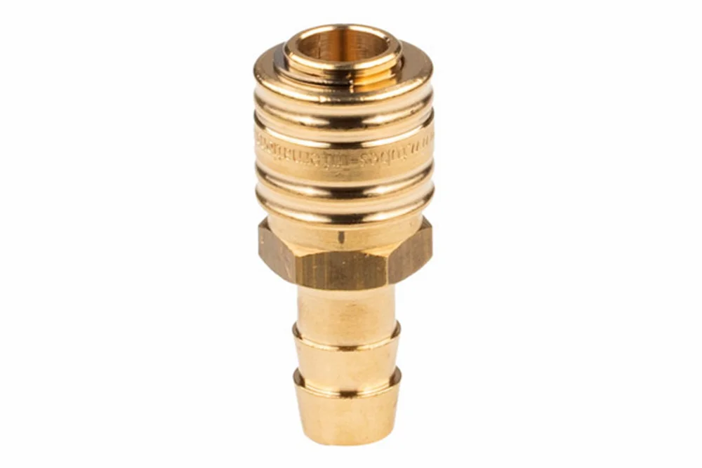 Quick coupling socket with a popular Eurostandard DN7.2 profile with a valve, with a hose fitting, for use in pneumatic installations (air, nitrogen, other non-flammable gases). The quick couplings are interchangeable with all quick couplings from other manufacturers according to Eurostandard DN7.2 ÷ 7.8 and compatible with tools found in stores. Easily operated with one hand at a pressure of 8 bar. Working pressure: 16 bar. Material: brass (pins and spring made of stainless steel). Flow rate: 1631 l/min, Pe=6 bar, Δp=1 bar (air). Operating temperature: from -20°C to +100°C.