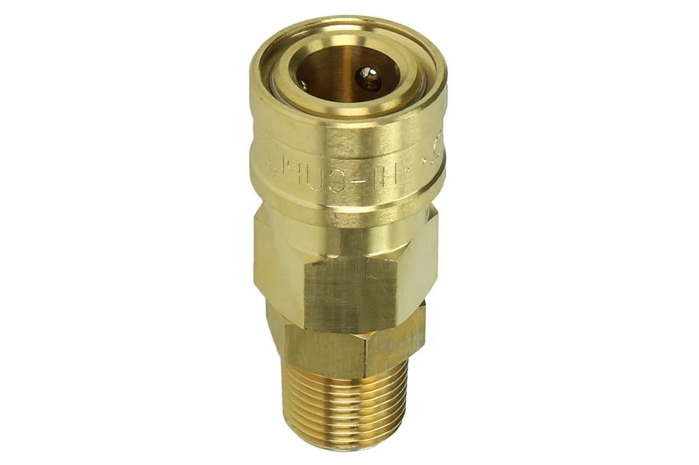Nitto Kohki HI CUPLA series socket with external BSPT thread, featuring excellent durability and vibration resistance. Designed for water installations. Material: brass. Working pressure: 10 bar. Operating temperature: from -20°C to +80°C (NBR). Flow rate: 4000 l/min (1″), 3200 l/min (3/4″), 2600 l/min (1/2″), 1600 l/min (3/8″), 1000 l/min (1/4″) at a pressure of 5 bar. Note: the medium must flow from the socket to the plug.