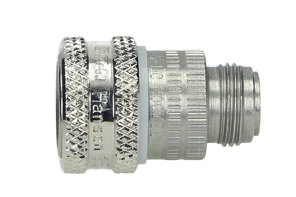 Hansen Beverage quick coupling socket without valve with external thread UNF 11/16″-18. The couplings are available in two versions: for gases type 2HG and for liquids type 2HL. These versions are not interchangeable (different plug diameter), which prevents connection errors. Identifying the version is very easy. For gas couplings, the identification ring on the socket is white, and the hexagon on the plug has a notch. For liquid couplings, the identification ring on the socket is black, and the hexagon on the plug does not have a notch. Working pressure: 15 bar. Operating temperature: up to +130°C.