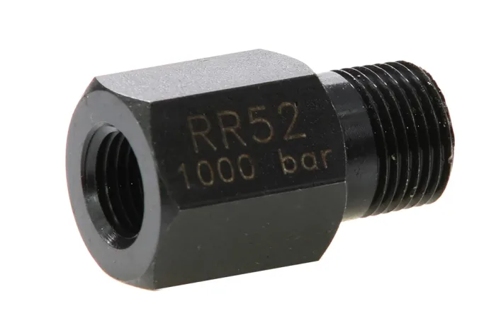 Reduction adapter with external and internal threads enabling the connection of quick couplings and UHP hoses, as well as connecting to UHP connection blocks. Material: carbon steel, black galvanized. Working pressure: 700 bar (with a safety factor of 4), 1000 bar (with a safety factor of 2.8).
