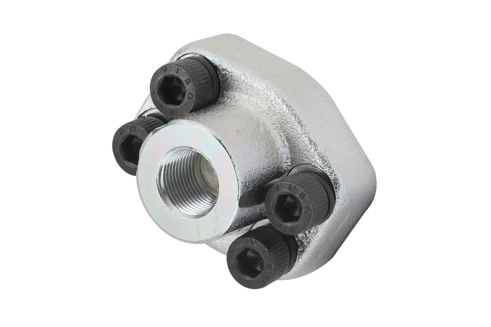 SAE 3000 flange connection with a compact design and internal BSP thread for use in hydraulic systems. Supplied with mounting screws and an O-ring seal (NBR). Material: carbon steel, galvanized. Operating temperature: from -20°C to +100°C.