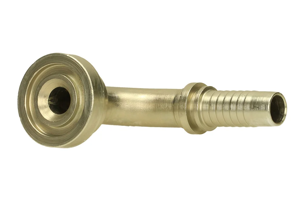 SAE 6000 flange end (SFL), 90° angled, heavy series. Designed for crimping in hydraulic and industrial hoses using a crimping sleeve suitable for the type of hose. Material: carbon steel, galvanized.