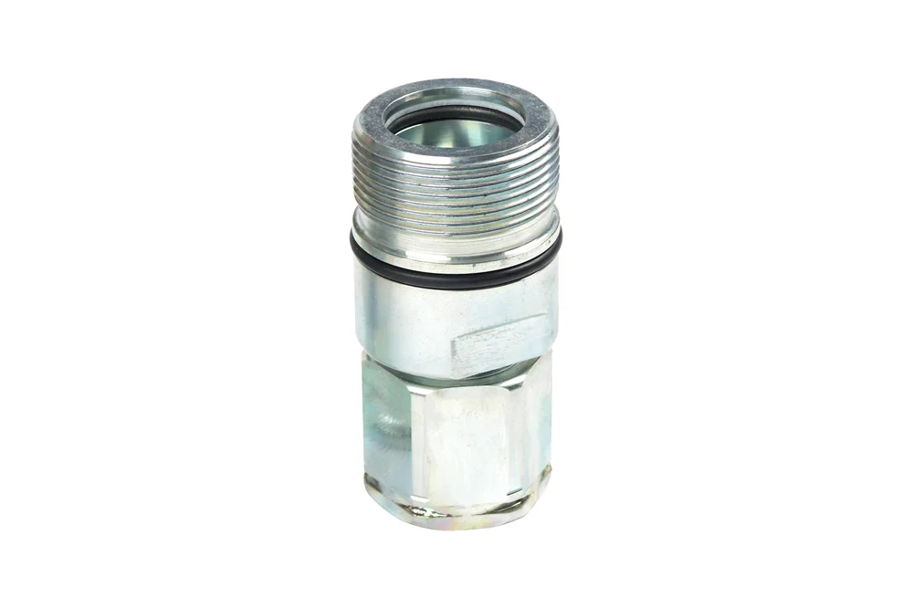 Screw-on quick coupling – socket, type HS with internal BSP thread. It has an additional O-ring on the socket body that prevents the quick coupling from unscrewing in situations of pulsating pressure and vibration. Tightening the quick coupling under static pressure is allowed up to a maximum of 50 bar. Application: hydraulic power (hydraulic oil). Material: galvanized steel. Socket sealing: NBR (operating temperature from -25°C to +100°C). Working pressure: up to 450 bar (depending on the size of the quick coupling). Safety factor 4:1. Flow has been provided for a pressure drop of 3 bar.