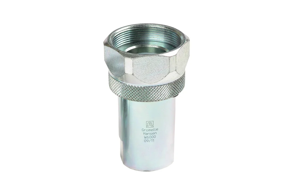 GROMELLE quick coupling socket with BSP, NPT, and shut-off valve, series W-6000. The screw quick coupling is designed for applications with high mechanical loads. Screwing the quick coupling under residual pressure up to 30 bar is permitted. In the case of pulsating pressure at the disconnected joint, the maximum working pressure should be reduced by 50%. Manufactured in accordance with the PED directive 2014/68/EU. Material: galvanized steel. Sealing: NBR (operating temperature: from -20°C to +100°C), viton (operating temperature: from -20°C to +200°C). Working pressure: up to 1100 bar (depending on the size of the quick coupling). Flow has been provided for a pressure drop of 3 bar.