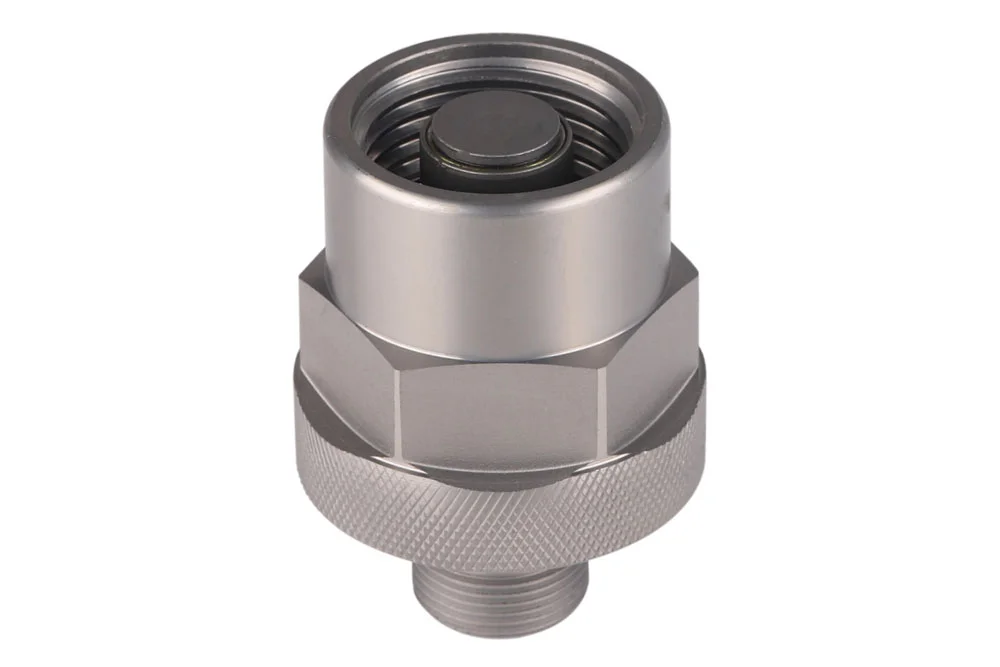Screw quick coupling with zero leakage – plug, type RH, with external metric thread DIN 2353. The flat design of the front surface prevents fluid loss during disconnection. Coupling is allowed under a residual pressure of 50 bar. Application: hydraulic power (hydraulic oil). Material: carbon steel with zinc-nickel coating. Operating temperature: from -25°C to +100°C. Working pressure: up to 420 bar (depending on the size of the coupling). Safety factor 4:1. Flow has been provided for a pressure drop of 3 bar.