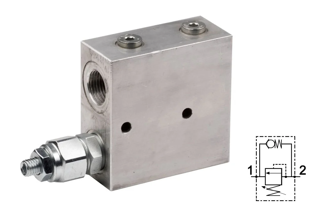 VS30 valves are used in hydraulic systems as a component to establish the supply sequence of several actuators connected to a single power source. In a system with two actuators, the valve is installed between the power source (1) and the actuator (2) that is to be supplied second. The opening pressure value is set using a screw (adjustment with an Allen key, locked with a locking nut). The valves are equipped with mounting holes. Special attention should be paid not to set the pressure value higher than 260 bar (maximum operating pressure for the aluminum body). Material: aluminum (body), galvanized steel (valve). Sealing: NBR. Operating temperature: from -20°C to +100°C.
