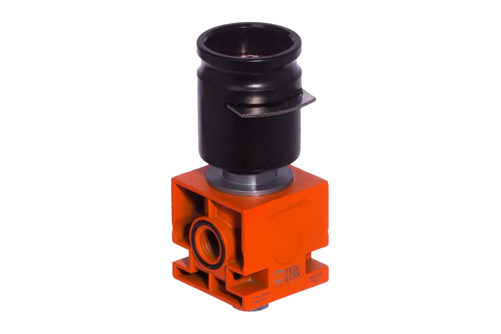 Manual shut-off valve V3V, NEW DEAL series, separates the working system from the supply air. It features a triple locking mechanism, and the valve opens by pressing a button. The mushroom system used ensures high flow rates. Connection: GW BSP 1/4″ to 1/2″. Supply pressure: up to 18 bar. Operating temperature: up to +50°C. Nominal flow: 1500 l/min for 1/4″ connection, 2900 l/min for 3/8″ and 1/2″ connections (at an inlet pressure of 6 bar and Δp = 1 bar).