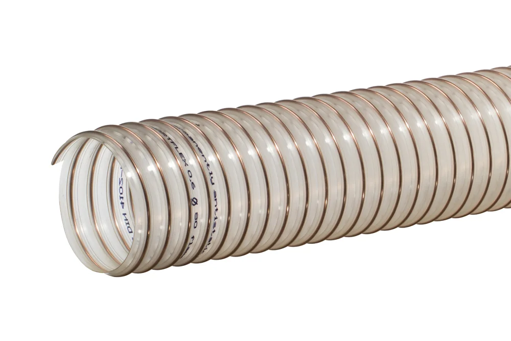 Light and flexible hose designed for the transport of air, dust, powders, wood shavings, fine chips, lightweight bulk materials, etc. Specifically designed according to the requirements of the woodworking and furniture industries, it can also be used in other industrial sectors. Antistatic and flame-retardant, it ensures high work safety. Flexible and elastic, even at low temperatures. Less compressible than the SMARTFLEX® 0.4 hose, but smoother on the inside. With very good abrasion resistance, also resistant to microbes and hydrolysis. Free from halogen compounds and plasticizers. Resistant to oils and gasoline. The optimal direction of medium flow is marked with an arrow. The wall thickness of the hose is measured between the spiral. Installation on couplings with bridge clamps (right-handed). Other diameters may be available upon special request. Antistatic properties: permanently antistatic (according to ISO 8031 resistance R <109 Ω, according to German technical regulations TRGS 727 (6.4.2.4) specific resistance R < 2.5 x 108 Ω, according to directive 2014/34/EU (ATEX) can be used in specific explosion hazard zones – which must be preceded by a risk analysis). After effective double grounding of the spiral, it can be treated as electrically conductive – in accordance with the recommendations of BGI 739-2. Flame-retardant – according to DIN 4102 class B1. Hose material: transparent polyester-polyurethane. Wall thickness measured between the spiral: 0.6 mm. Reinforcement: spiral made of steel wire. Operating temperature: from -40°C to +100°C (temporarily up to +125°C).