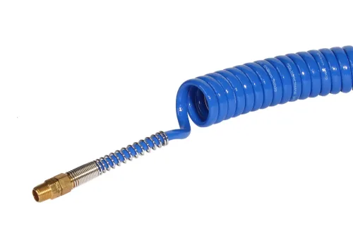 Polyurethane spiral hose designed for pneumatic control systems, hand tools, industrial robots, etc. Resistant to abrasion, rupture, and kinking, successfully used in the automotive industry as well. Its high flexibility is maintained even after many years of use. Finished on both ends with straight sections of 100 mm and 500 mm and external BSPT threaded ends (without springs for an outer diameter of 16 mm). The stated total length is the maximum length of the hose when stretched. Hose material: blue polyurethane PUR. Working pressure: up to 17 bar (depending on hose diameter). Operating temperature: from -40°C to +60°C.