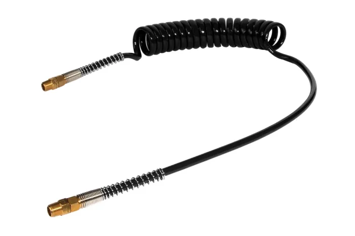 Very flexible spiral hose over a wide temperature range, resistant to abrasion, welding sparks, and hot metal chips. Designed for pneumatic control systems, hand tools, industrial robots, etc. Resistant to UV radiation and aging. Finished on both ends with straight sections of 100 mm and 500 mm and external BSPT threaded ends. Shore hardness (A) 98°. The stated total length is the maximum length of the hose when stretched. Hose material: flame-retardant polyurethane PUR. Working pressure: up to 13 bar (depending on hose diameter). Operating temperature: from -40°C to +70°C. Standards: UL 94 VO (outer layer). Color black.