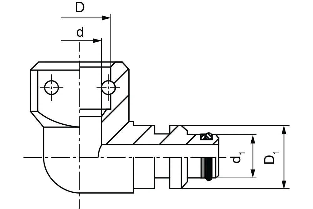STECKO socket-plug elbow for use in hydraulic systems for mining. Material: automatic steel, galvanized. Sealing: NBR (o-ring), Teflon (back-up ring).