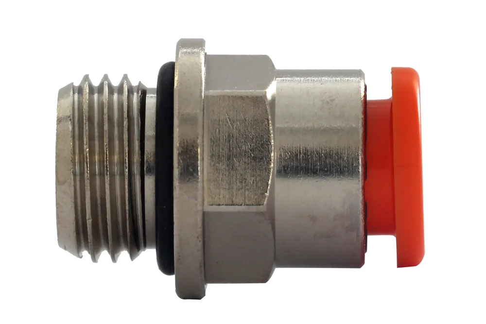 Straight plug connector with external thread, type R1, intended for connecting wires and other components in pneumatic systems. Easy and quick to use for multiple assemblies without loss of sealing on the mechanical and pneumatic sides. Material: nickel-plated brass. Working pressure: 16 bar. Working medium: vacuum, air. Operating temperature: from -20°C to +80°C. Sealing: NBR.
