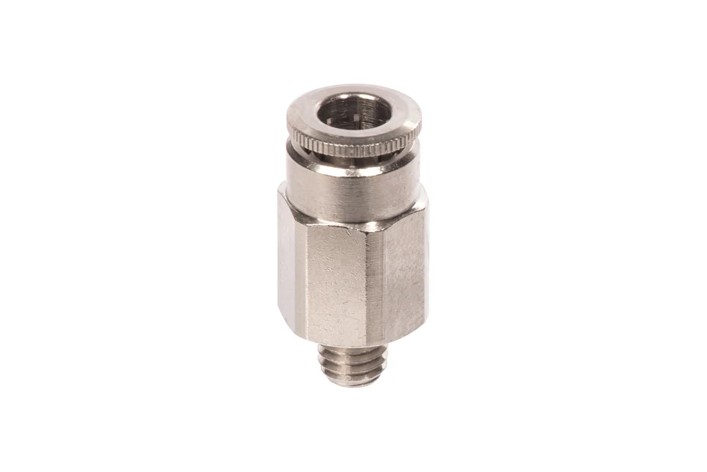 Straight PUSH-IN connector for hose with external BSPT or metric thread. For use in lubrication technology. The recommended material for connected hoses is polyamide. Body material: nickel-plated brass. Sealing material: o-ring (HNBR). Operating temperature: from -30°C to +150°C. Maximum working pressure: 150 bar (for liquids), 30 bar (for air).