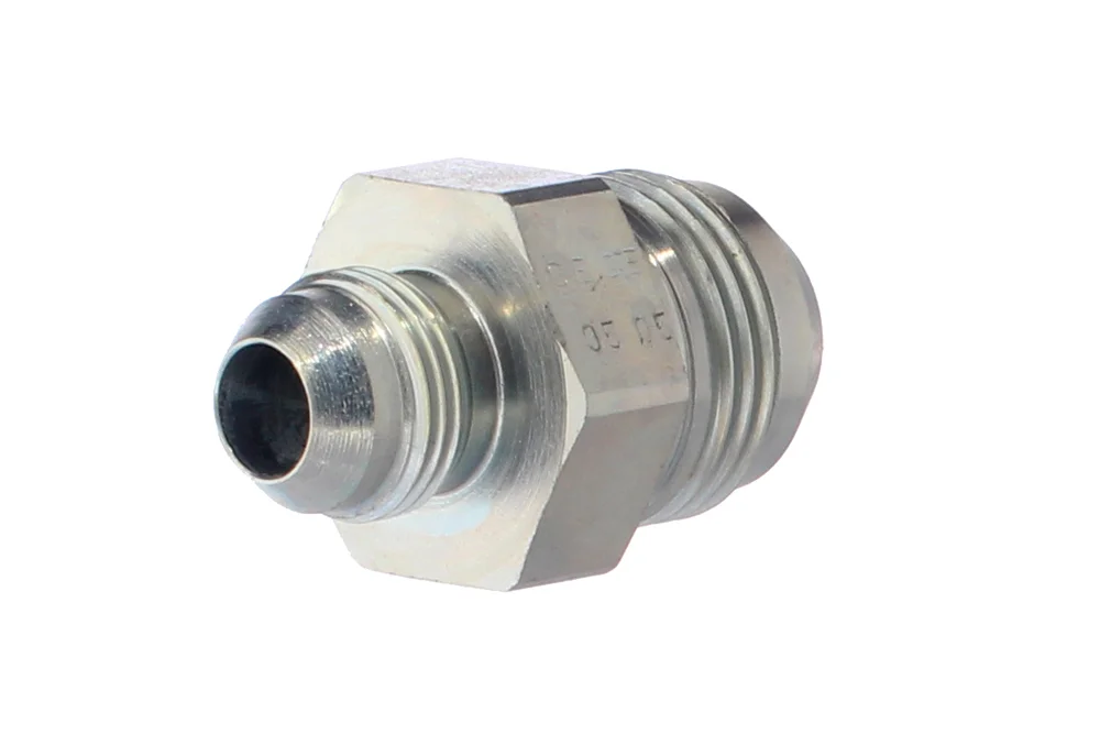 Straight reducing fitting JIC 37° with external UNF thread (seal on 37° cone). Material: carbon steel, galvanized.