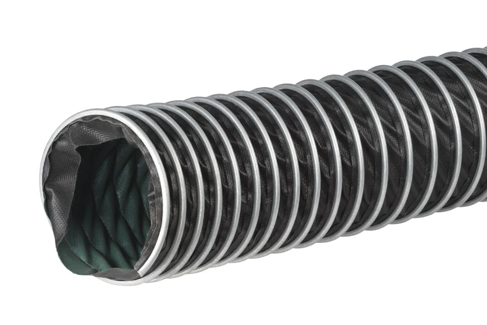 Lightweight, highly flexible and bendable, chemically resistant hose designed for the extraction and transfer of aggressive chemical vapors from solvents, paints, hydrocarbons, chemicals, etc. Thanks to the conductive FKM rubber, it has antistatic properties (surface resistance R <106 Ω). Very good resistance to oil, aromatic substances, most acids, and chemicals. Excellent resistance to elevated temperatures. Resistant to UV radiation and ozone. Characterized by high compressibility – up to 1:6, strong construction resistant to vibrations and stretching, impact resistance due to the external spiral. Used in the paint, chemical, and paper industries. Also available with a stainless steel spiral (from a diameter of 80 mm). Hose installation on couplings with bridge clamps (left-handed). Chemical resistance verification – chemical resistance table for FKM (preliminary selection), confirmation of resistance and application conditions – by Tubes International. Standard length: from 2 to 10 m. Hose material: polyester fabric coated with FKM, antistatic, externally black. Reinforcement: external spiral made of steel sheet and wire. Operating temperature: from -25°C to +210°C.