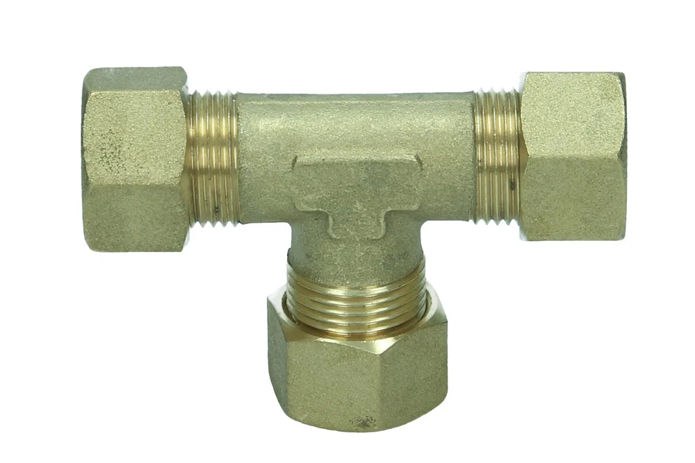 Tee fitting “T” type AI 13200 designed for connecting copper, brass, steel, aluminum pipes, etc., as well as plastic pipes and hoses (e.g., polyamide). The range of external diameters of connected pipes is from 4 to 22 mm. The tightness of the connection is achieved by crimping the ring on the connected pipe and simultaneously pressing the pipe with the ring into the socket using a nut. Standard: EN 1254-2. Material: brass.