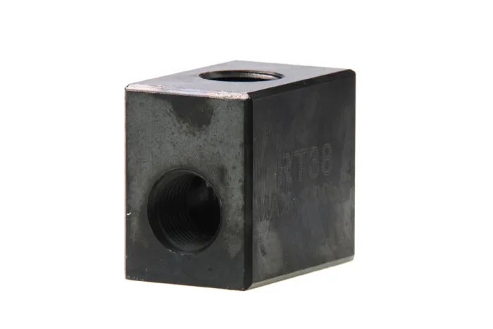 T-type block tee with internal thread enabling the connection of quick couplings and UHP hoses. Material: carbon steel, black galvanized. Working pressure: 700 bar (with a safety factor of 4), 1000 bar (with a safety factor of 2.8).