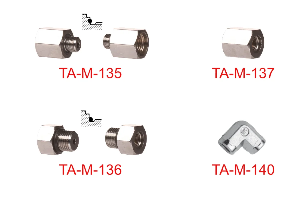Threaded adapter designed for connecting with other components of the TEMA 100 measurement system. Available in straight and angled (90°) versions. Material: nickel-plated brass.