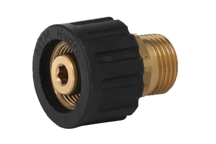 Three-part adapter for high-pressure cleaning devices with metric connection M22x1.5. Material: brass. Working pressure: up to 280 bar. Operating temperature: up to +160°C.