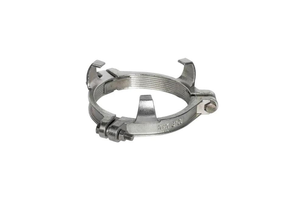Three-part clamp according to DIN 20039 B, with hooks (“claws”) on the flange to secure the ends and with separate inserts – “tongues” for pressing. Material: ductile cast iron galvanized. With proper installation, appropriately selected hose and fitting, working pressure up to 25 bar.