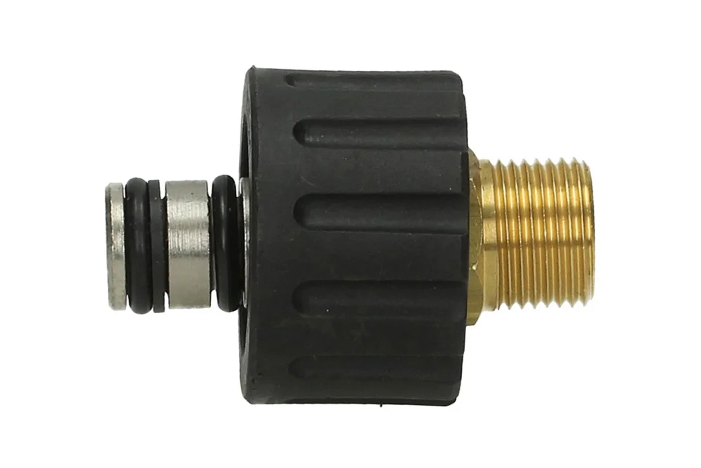 Three-part long adaptor for high-pressure cleaning devices with metric connection M22x1.5. Material: brass. Working pressure: up to 280 bar. Operating temperature: up to +160°C.