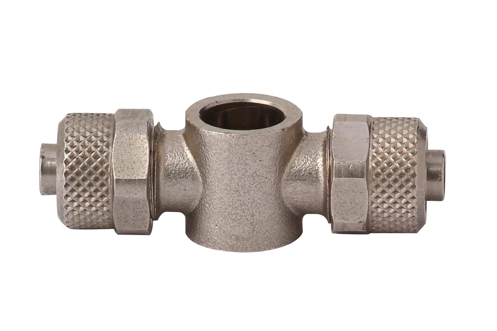 Banjo tee body connector with D6 type socket connections, designed for hoses made of soft plastics. The connection is made by fitting the hose onto the end and tightening with a nut. The Banjo tee body connector allows for positioning the connector in the desired orientation. Through bolts for the body: D7, D8, D9, D10. Material: nickel-plated brass. Working pressure: 18 bar.