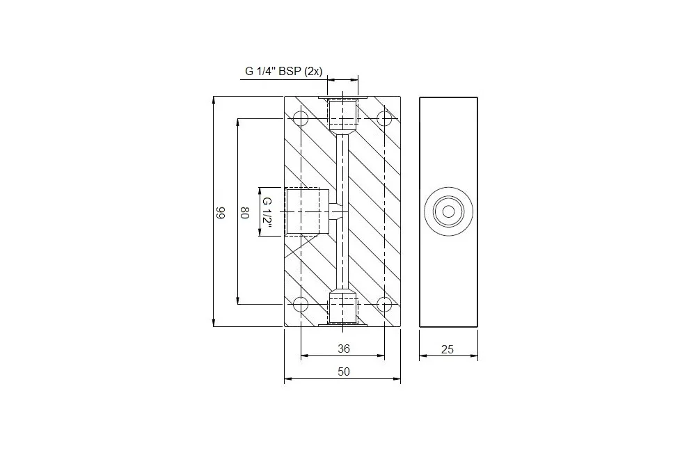 Three-way manifold block allowing the connection of multiple high-pressure hoses to a single pump, as well as the connection of a pressure gauge. Made of black zinc-coated steel. Flow diameter 5 mm (3/16″). Connections: 2 x 1/4″ BSP, 1 x 1/2″ BSP (NBR o-ring). Connection sealing: internal cone 120°. Working pressure: 2000 bar (maximum working pressure when using a metal-rubber seal is 1000 bar).
