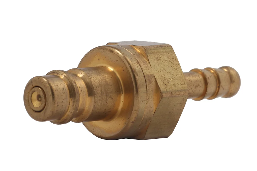 Two-sided shut-off quick coupling plug series 25 DN 7.4 with hose end, characterized by a robust construction, ensuring perfect sealing and a very high flow rate due to the use of the ULTRA-FLO valve. Application: laboratory equipment, sampling of liquids and gases, pneumatic tools. Working pressure: 35 bar. Flow rate: 780 l/min, Pe=6 bar, Δp=0.5 bar, air. Material: brass (plug, plug end), brass (valve), AISI 301 steel (spring). Sealing: NBR. Operating temperature: from -20°C to +100°C, depending on the medium.