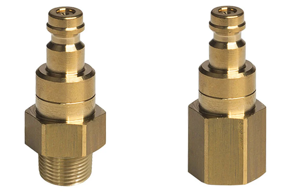 Quick-release coupling plug, double shut-off, Eurostandard DN5 (MINI), series 21KB with external or internal BSP thread. The double shut-off version has a valve in the socket and in the plug, and should not be connected with the single shut-off version, as the valve will not open. Widely used in the industry where small dimensions are required with high flow efficiency and low pressure drop. One-handed operation. Working pressure: 35 bar. Material: brass, stainless steel (springs and balls). Sealing: NBR. Operating temperature: from -20°C to +100°C.